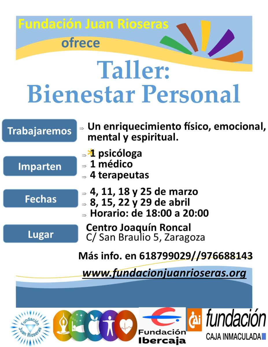 Este mes de mayo seguimos con nuestro Taller de Bienestar Personal, en el Centro Joaquín Roncal de Zaragoza. Os peramos.