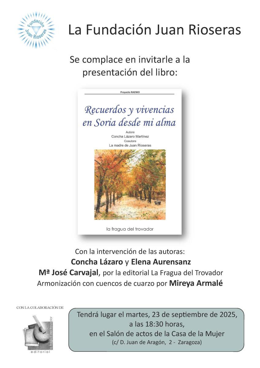 El día 23 de septiembre celebramos la presentación del libro "Recuerdos y vivencias en Soria desde mi alma" en el salón de actos de la Casa de la Mujer de Zaragoza.