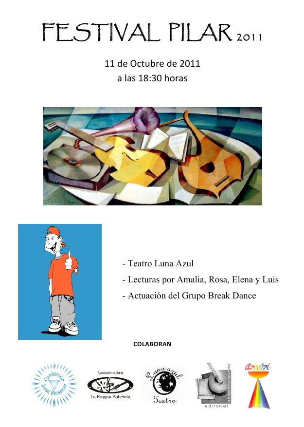 La Fundación Juan Rioseras; Asociación Cultural La Fragua Bohemia; Teatro Luna Azul; editorial La Fragua del Trovador; Asociación Aragonesa Madres y Mujeres ArcoIris y la colaboración de Jóvenes del Centro de Educación e Internamiento por Medida Judicial de Zaragoza. Hemos celebrado un "Festival Pilar 2011" de risas, música, bailes y lecturas en dicho Centro.
